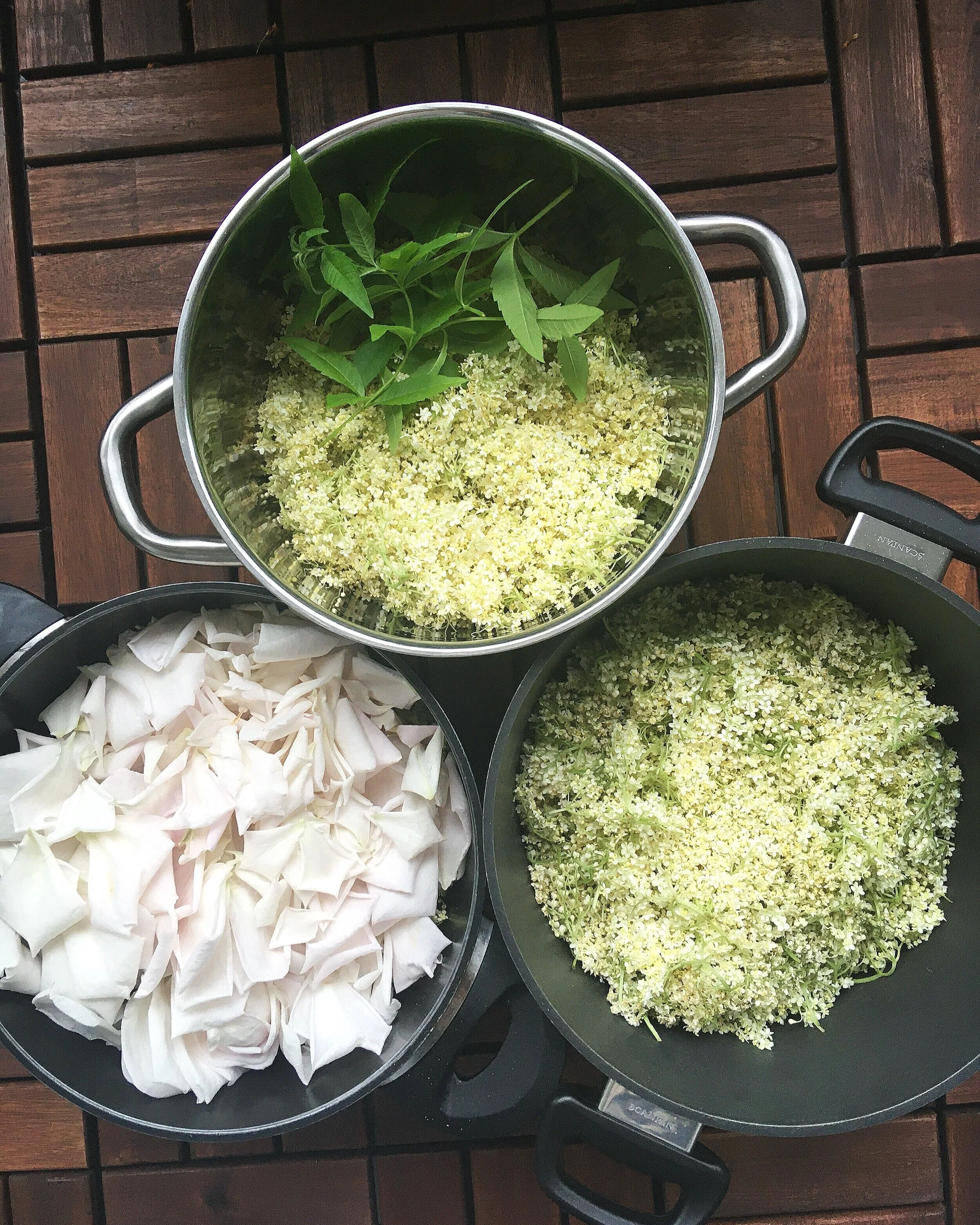 Så til ovenstående opskrift brugte jeg 45 skærme hyldeblomst og ca. 5 dl rosenblade.